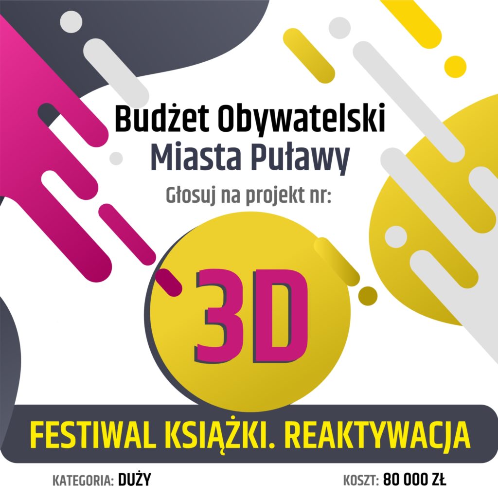 Budżet Obywatelski Miasta Puławy. Głosuj na projekt nr 3D "Festiwal Książki. Reaktywacja". Kategoria : duży. Koszt: 80 000 złotych. Projekt zakłada organizację ogólnodostępnych, nieodpłatnych i różnorodnych wydarzeń kulturalno-literackich w Mediatece, w ramach kilkudniowego Festiwalu Książki. Wśród realizowanych działań znajdą się m.in. spotkania autorskie z pisarzami reprezentującymi różne gatunki literackie i specjalistami z zakresu dziedzin nauki, warsztaty czy wydarzenia słowno-muzyczne adresowane do wszystkich grup wiekowych. Festiwal Książki. Reaktywacja będzie nawiązaniem do tradycji Festiwalu Książki, który przez wiele lat, z dużym powodzeniem realizowała Biblioteka Miejska. Wskrzeszenie idei kilkudniowego święta literackiego to dobra okazja do spotkania z autorami bestsellerowych książek, specjalistami z różnych dziedzin wiedzy, edukatorami, którzy poprowadzą ciekawe warsztaty i twórcami kultury.Wydarzenia będą także okazją do integracji mieszkańców i inspirujących rozmów o literaturze, poszerzą ofertę kulturalną i wpłyną na rozwój czytelnictwa w naszym mieście. Głosowanie trwa od 8 do 14 września 2025 na pulawy.budzetobywatelski.pl. Uwaga! zachęcamy do głosowanie w Mediatece z pomocą bibliotekarza.