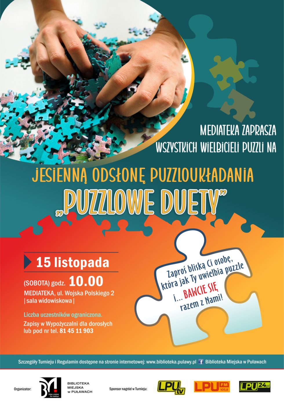 Jesień to idealny czas na układanie puzzli, dlatego serdecznie zapraszamy wszystkich wielbicieli puzzli do wzięcia udziału w „Puzzlowych Duetach”. Ta forma rozrywki to nie tylko wspaniała okazja do spędzania wolnego czasu z najbliższymi lub przyjaciółmi, ale przede wszystkim świetny sposób na rozwijanie umiejętności logicznego myślenia i koncentracji. Puzzle pozytywnie wpływają na pamięć wzrokową, motywują do działania i uczą wytrwałości w dążeniu do celu, a ich ułożenie daje dużo satysfakcji. Wzmacniają także wiarę w siebie oraz własne możliwości. Jeśli układamy je z innymi, uczą też pracy w grupie. Co bardzo ważne, pomagają osiągnąć stan wyciszenia. Dlatego układanie puzzli jest tak przyjemną formą spędzania wolnego czasu.